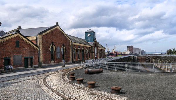 The adjacent building is the dock's Pumphouse and was used to pump out water from the dock. The Pumphouse originally served the Alexandra Graving Dock, located on the other side of the Pumphouse from the Thompson Graving Dock, and was extended to provide additional pumping capacity for the new Thompson Graving Dock. The powerful pumps were able to drain Thompson Dock of 26m imperial gallons of water in just 90 minutes - a rate of 2 swimming pools per minute.